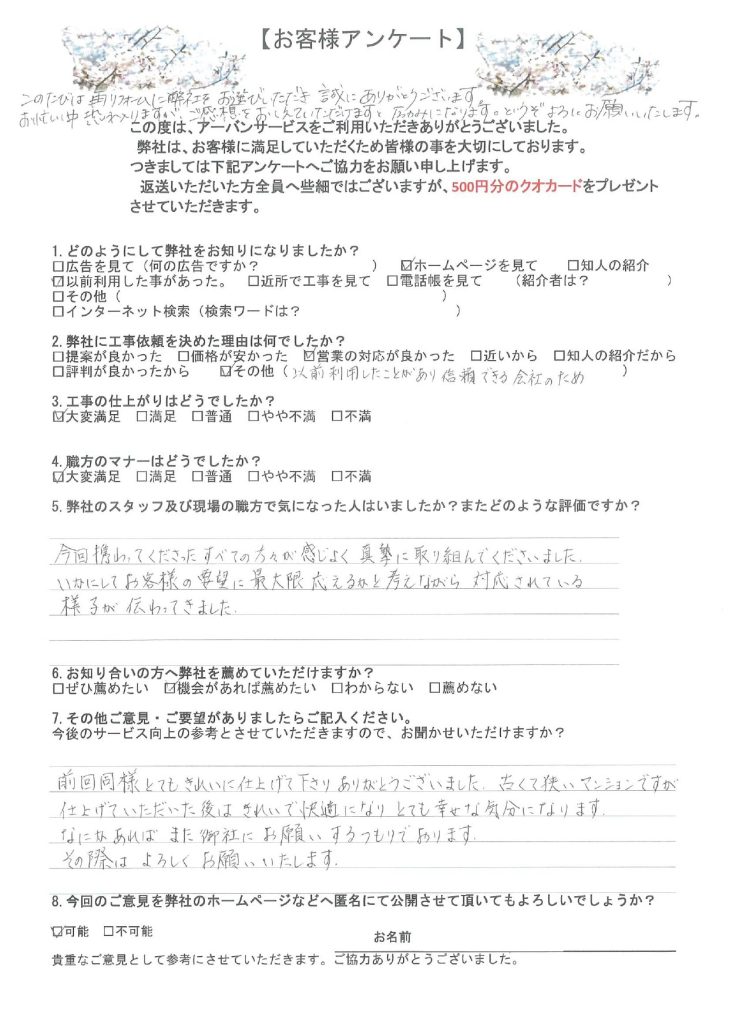 東京都大田区 M様より頂いたリフォーム後アンケート|マンション室内のリフォーム工事