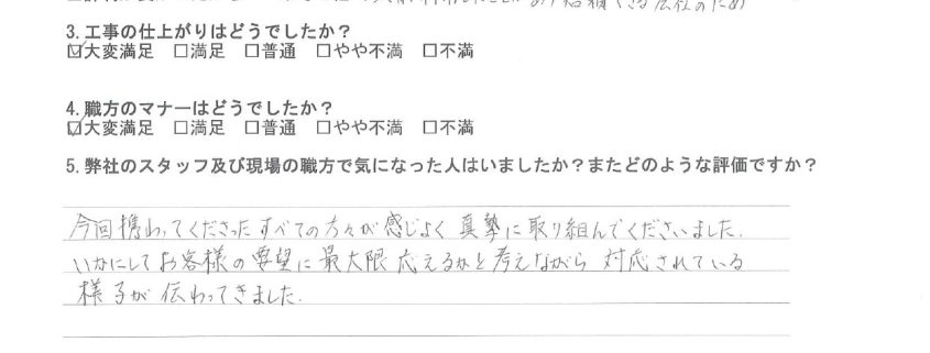 お客様より「担当者が真摯に取り組み、最大限お客様の要望に応えようとしてくれたことが伝わった」とのお言葉を頂戴し、大変光栄に存じます。現場のスタッフ一同も大きな励みとなり、今後の仕事へのさらなる意欲につながっております。