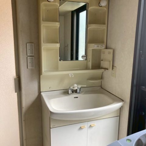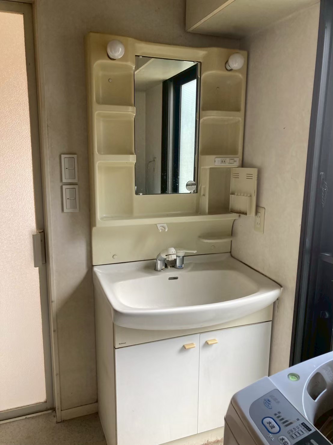 施工前の洗面化粧台は、長年使用された樹脂製キャビネットと照明一体型ミラーが特徴でしたが、