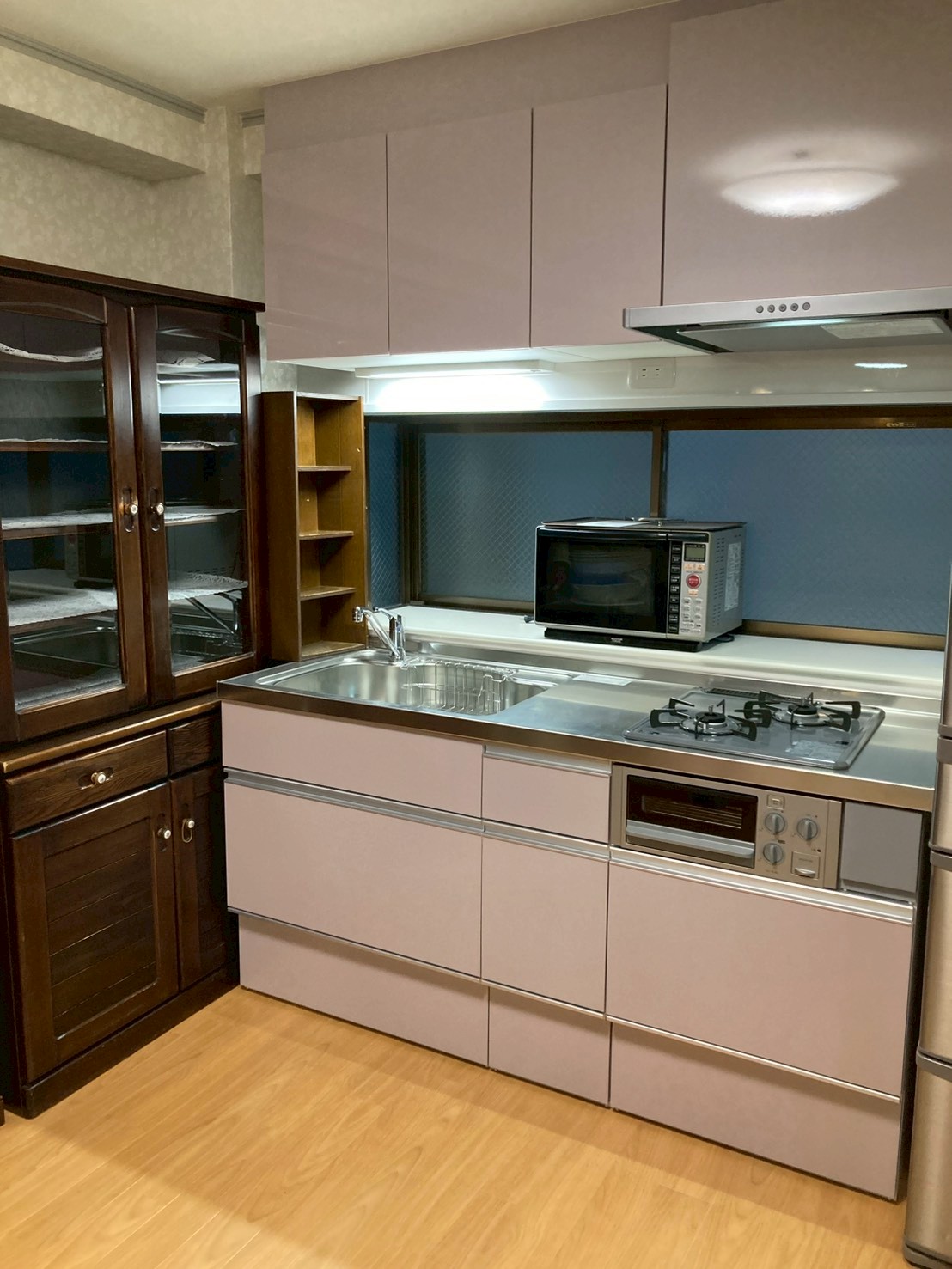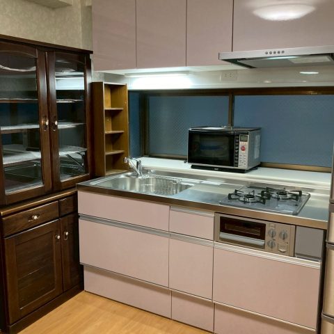 施工後のキッチンは、淡いピンク系の扉カラー「アコードロゼ」とステンレスワークトップの組み合わせにより、明るく上品な印象へと一新されました。