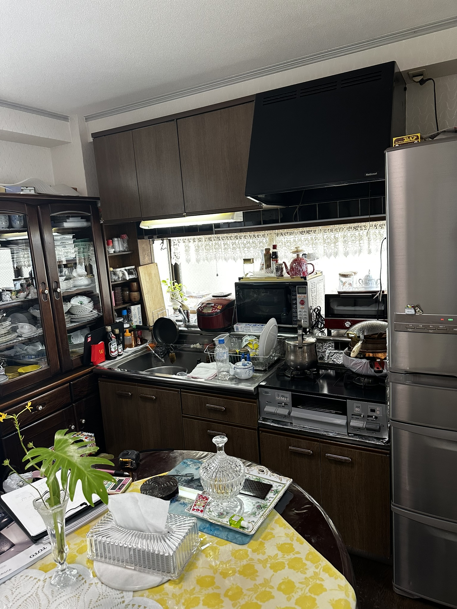 W様邸のキッチンは、長年使われてきた木目調タイプで、「収納のしづらさ」「換気扇の汚れ」「暗い印象」が気になっていたとのことでした。