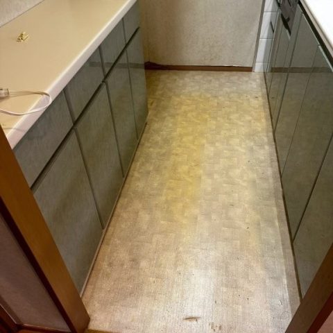 T様邸のキッチンスペースでは、長年使用されてきた床材やクロスに、経年による汚れ・くすみ・使用感が徐々に現れていました。