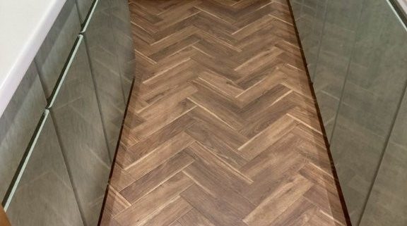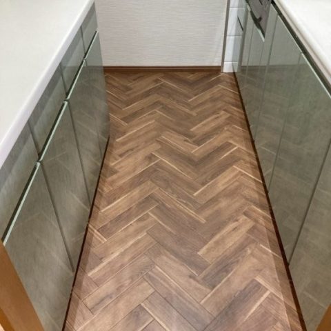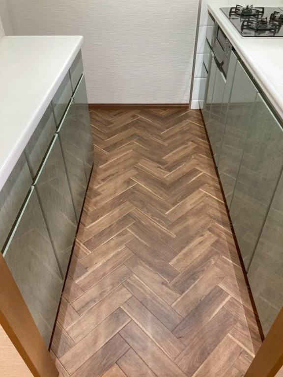 木目の濃淡が美しいヘリンボーン柄で、キッチンの細長い空間に奥行きと高級感を与えてくれるデザインです。