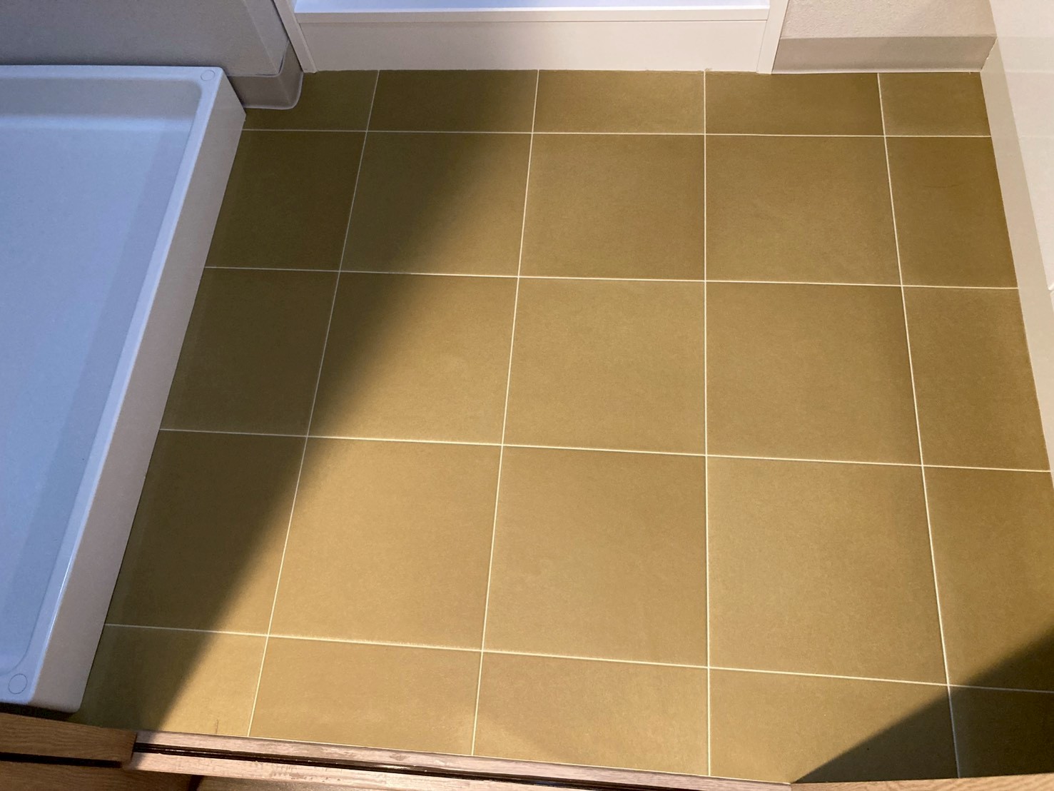 洗面所の床張り替え後の様子。サンゲツHM17039のタイル調フロアで明るく清潔感のある仕上がり(東京都大田区マンション)