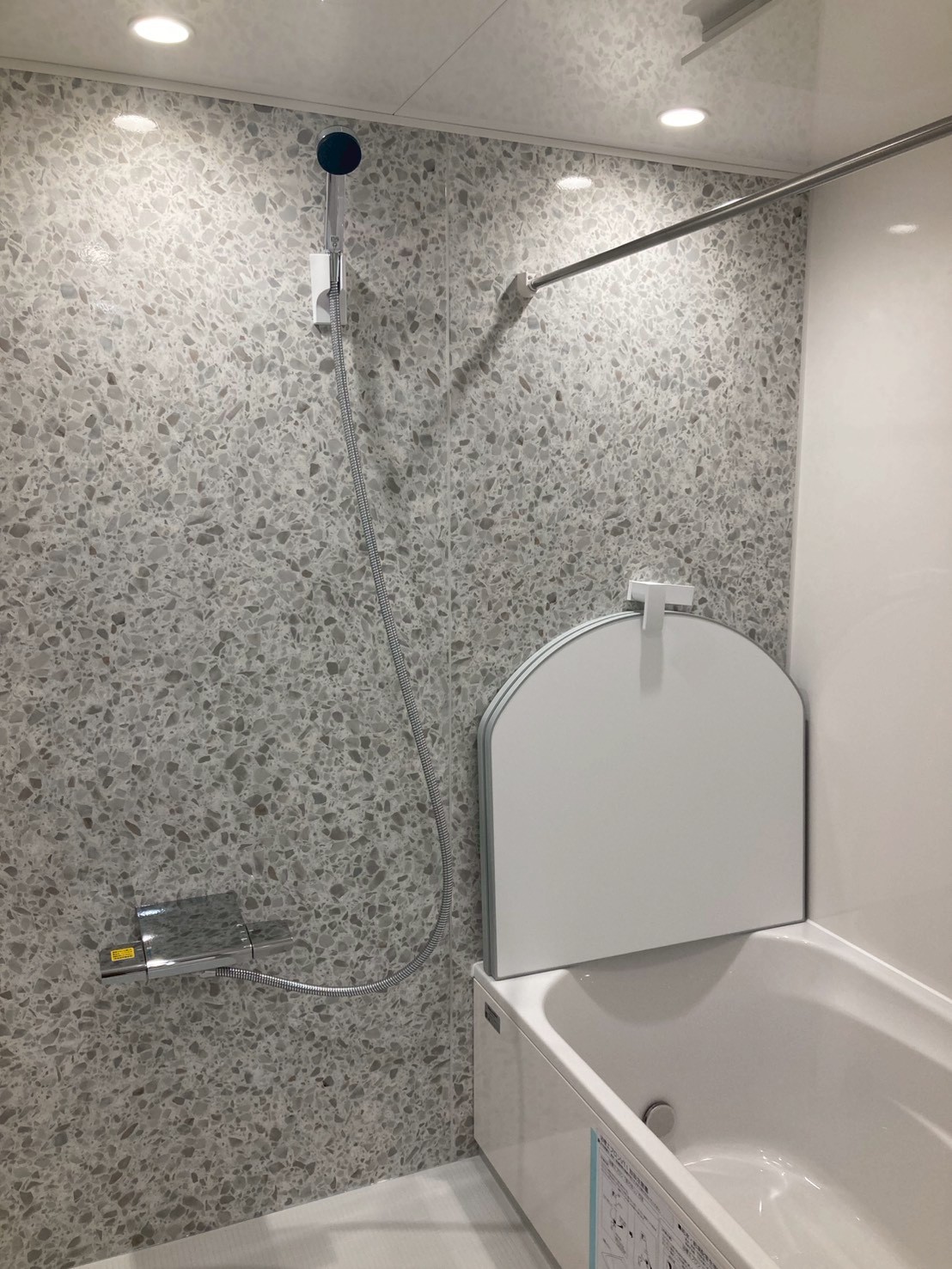 マンション浴室リフォーム後のユニットバス内部。明るい石目調パネルと使いやすいシャワー位置の施工例