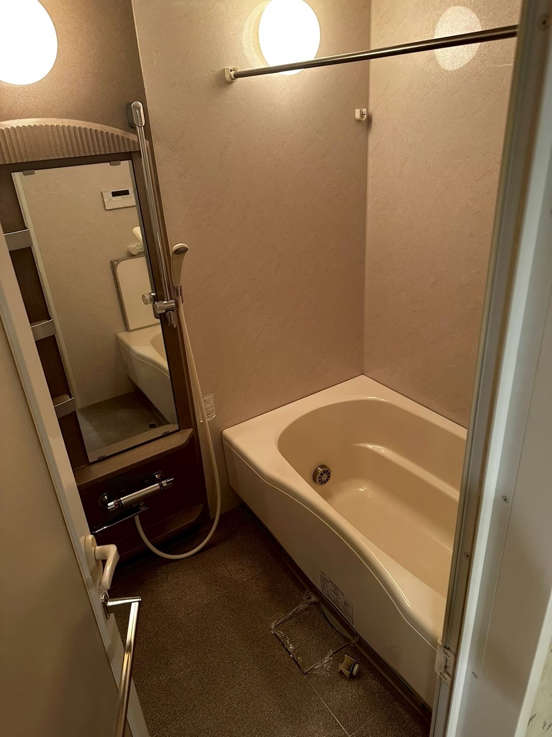 施工前の浴室は、必要機能は満たしつつも、全体的に経年感が出やすい仕様でした。写真からも、照明の当たり方や壁面の色味により、浴室内がやや暗く感じやすい状態が読み取れます。