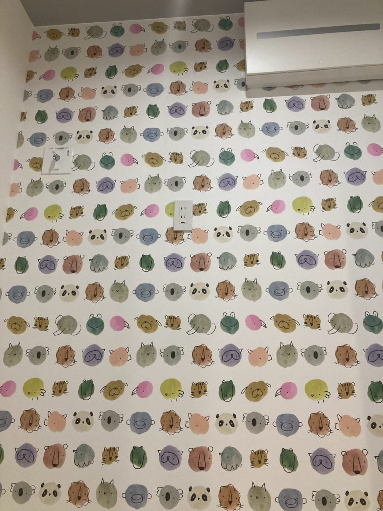 施工後写真では、動物柄のアクセントクロスが空間の主役となり、印象が大きく変わっています。