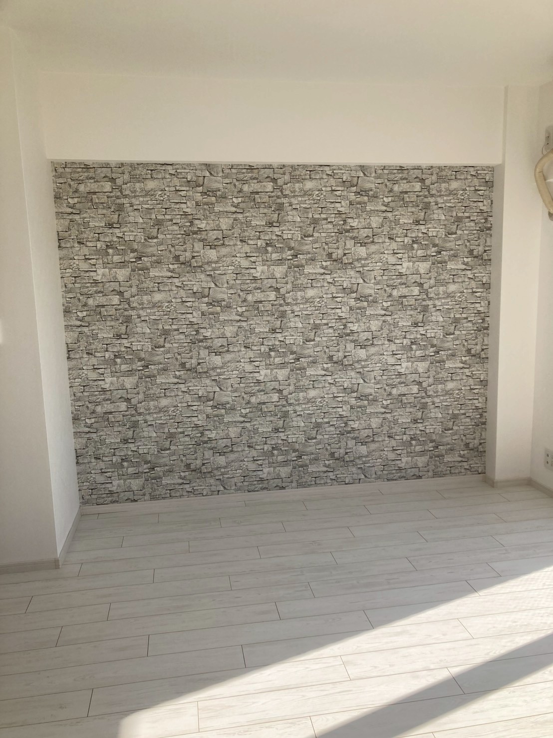 施工後は、床がアッシュホワイト系に変わったことで室内全体の明るさが上がり、アクセント壁の石目調クロスが程よい奥行きと質感を生む空間へと整いました。
