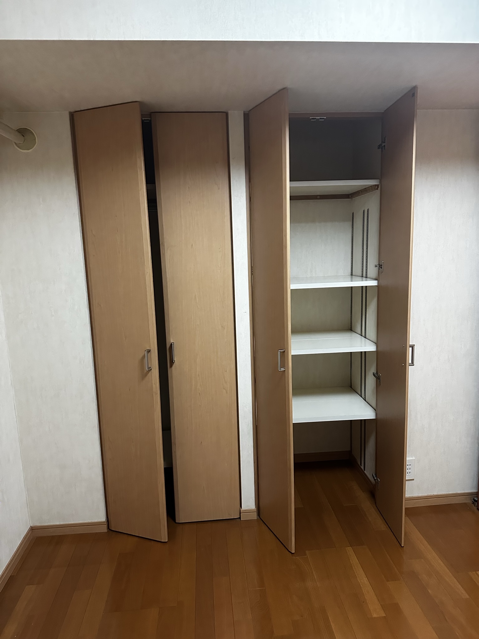| 施工内容 | 既存クローゼット解体撤去/間仕切り壁撤去/収納スペース拡張/新規クローゼット造作/枕棚・ハンガーパイプ設置/内部クロス貼替/床フローリング張替(NODAカナエルR)/建具交換(開き戸→引き戸へ変更)/開口部枠調整・仕上げ |