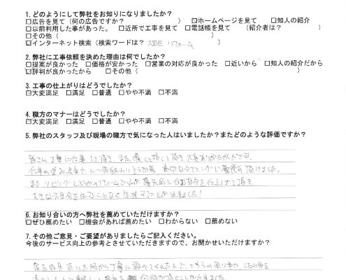この度は弊社のリフォーム工事をご利用いただき、また貴重なお時間を割いてアンケートにご協力いただき誠にありがとうございます。